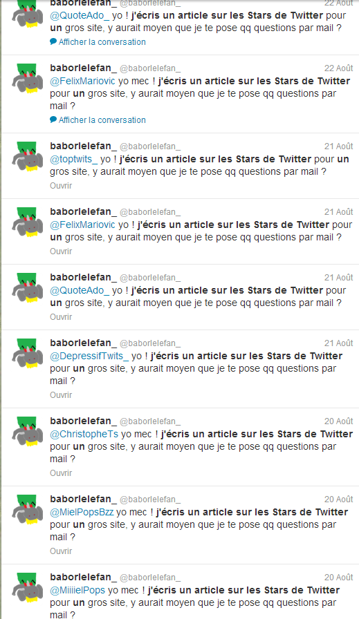 Etan moi même féru de Twitter, le célèbre rézo social de Mark Zuckerberg, jen ai tou de suite fai une affaire personnel. Je savai ke mes recherche m’amenerai sans doute dans les bas fond de l’internet, ou de nombreux complo glauque se trame mai ma soif de vérité, et les 12 lingot d’or promis par Ragemag avai réussi à me convaincre.