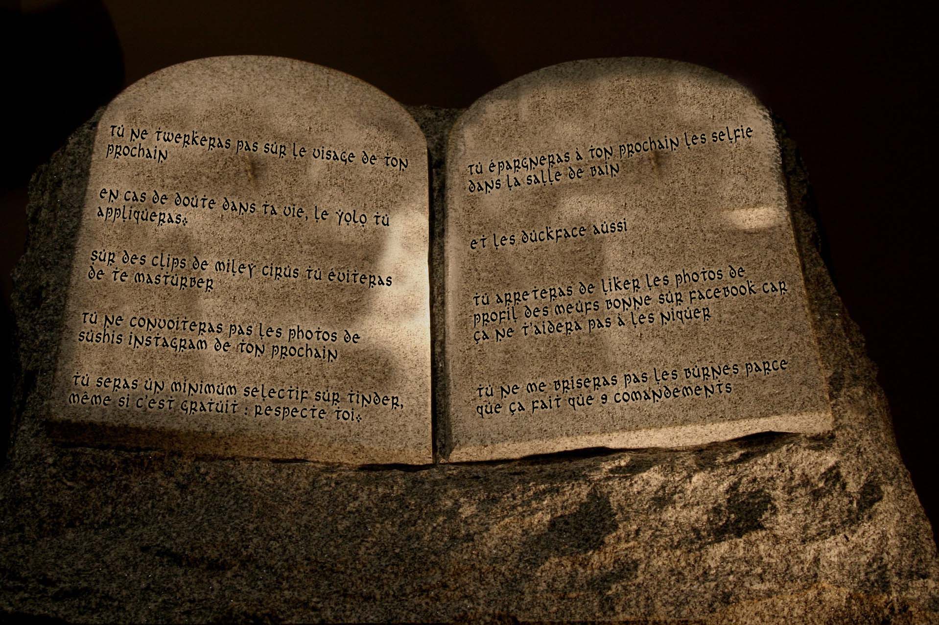 « Hey Bab’, Moïse c’est un peu un boloss, depuis qu’il sort avec Paris Hilton, il a changé, est-ce que tu pourrais me rendre un service ? Tu vois bro’, j’ai mis à jour les 10 commandements, si tu pouvais les poster sur Twitter et faire tourner un peu de bordel ça serait cool TMTC. »