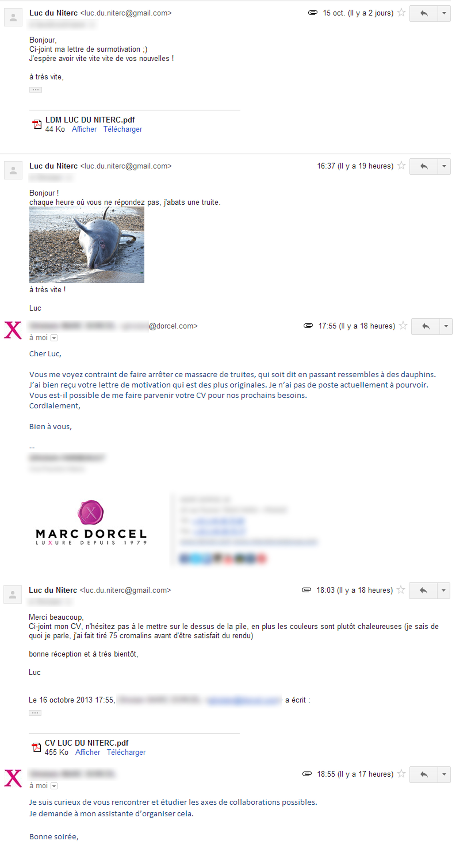 Le CV apocalypse now avec le num du père noel, les actimel ainsi que la LM du comptable c’était vraiment genial ! Et la réponse « désolé je tape qu’avec un seul doigt »… :’D
