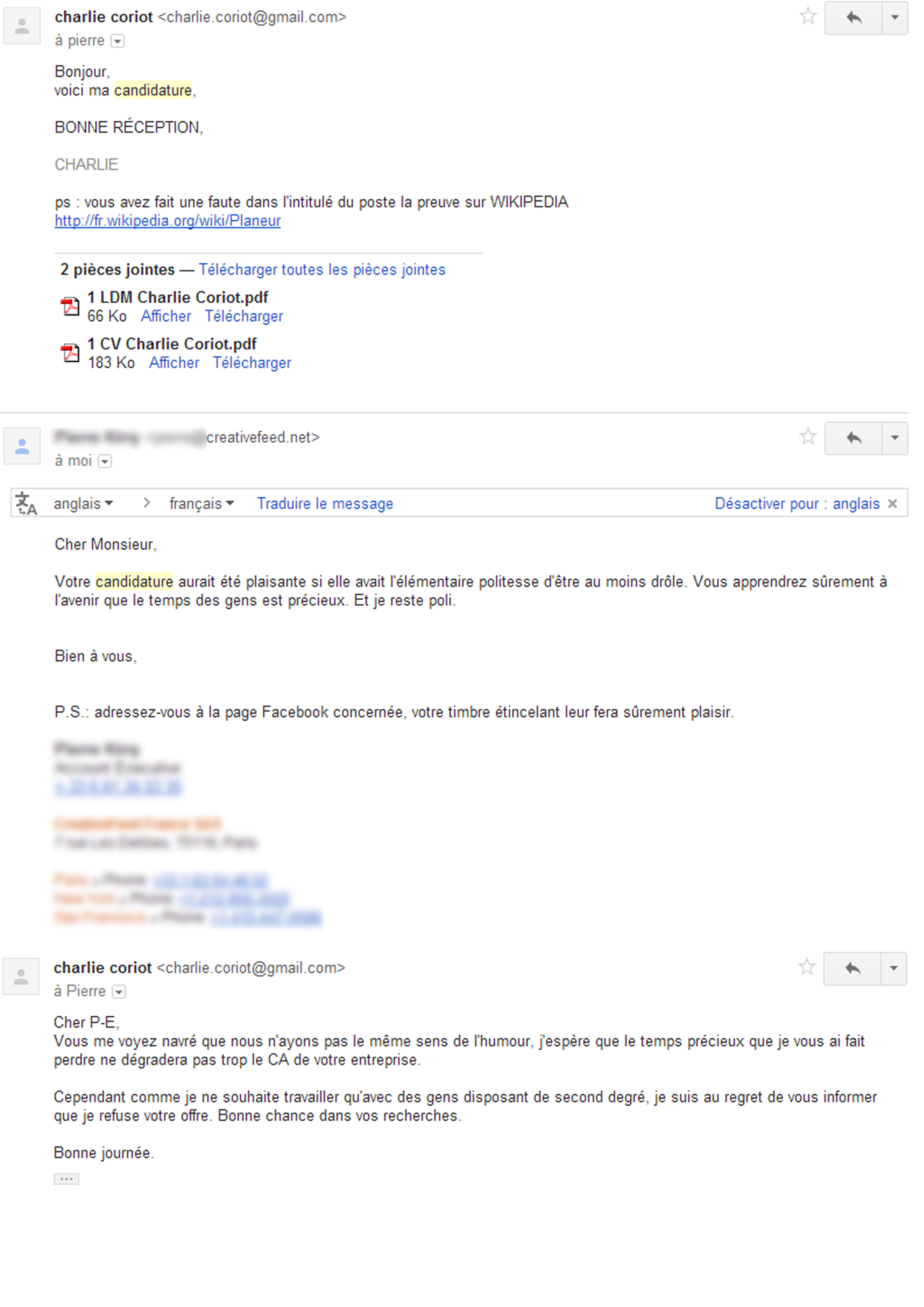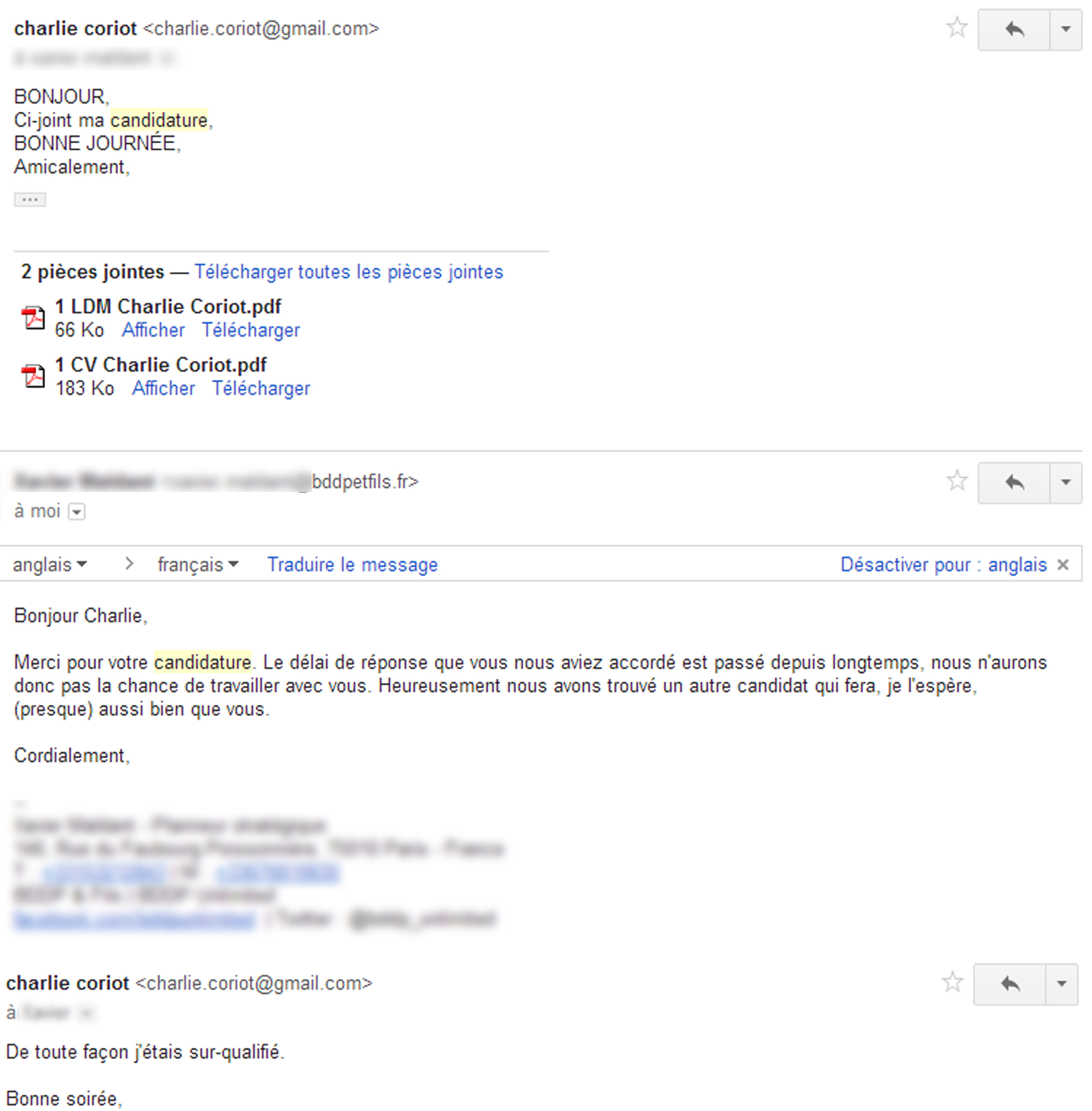 (Alors oui, parfois je m’appelle Charlie, parfois Jean Massoude, parfois Luc du Niterc, j’ai de nombreuses identités numériques, je vous demanderais de ne pas me juger, pourquoi je n’ai pas postulé partout avec le même mail ? Et bien ça, c’est secret défense…. défense / éléphant … lol ..)