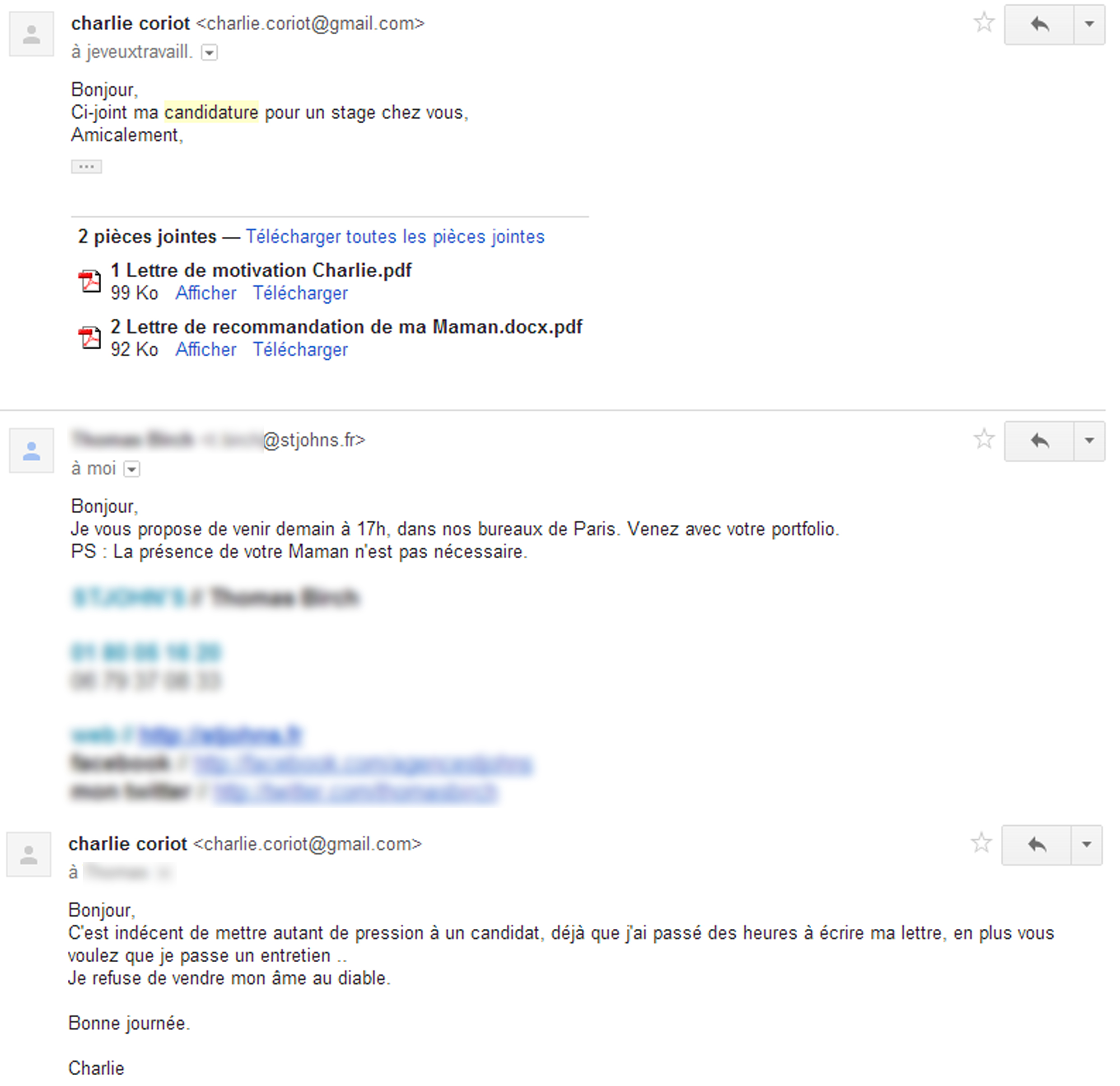 Et bien selon moi, il faut susciter des émotions forte chez votre recruteur potentiel. J’ai donc testé pour vous plusieurs styles de candidatures radicalement différentes, avec des profils radicalement différents, pour des résultats radicalement différents, pour des postes radicalement différents.