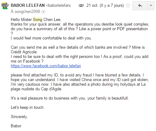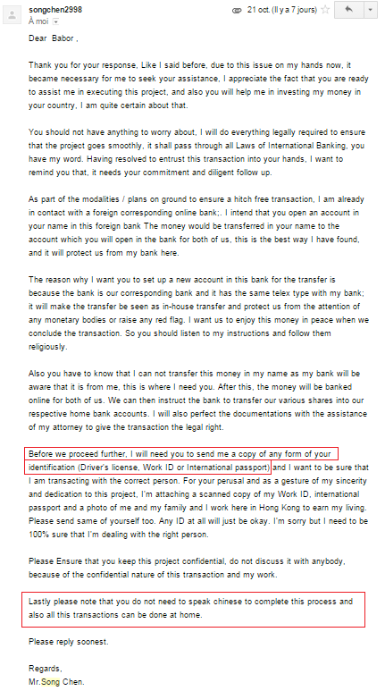 Bon, à ce stade, je pense que l’astuce est claire. Il se fait passer pour une banque existante, il récupère toute les infos dont il a besoin : le formulaire + ma pièce d’identité. Il ouvre le compte en mon nom, et invente un montant minimum pour valider ce compte. Il attend que je lui transfère le « montant minimum » et après il a plus qu’à se faire un virement avec sa thune.  MALIN CE PETIT SONG CHEN.