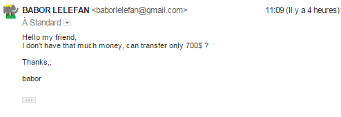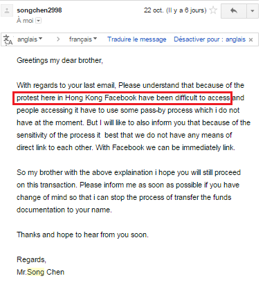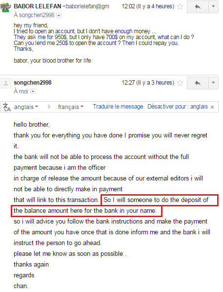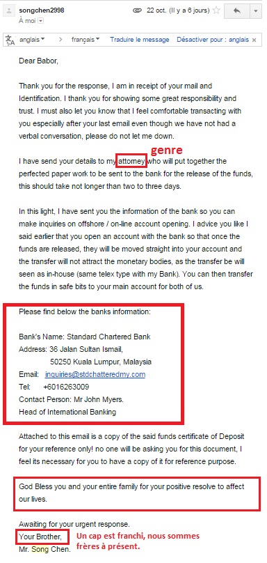 Comme mon nouvel ami est plutôt bavard, je vous ai entouré les passages importants en rouge. Comme le sang. Mais en gros, il veut que je l’aide à transférer des fonds de son pays au mien.