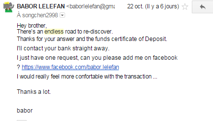 1. Moi aussi j’ai répondu à un scam, au bout de 6 mois de négoces j’ai finis par le faire venir à mon pays (Tunisie) pour me livrer un box plein de blé, en contre partie je devais payer les frais de douane pour dédouaner le box, comme quoi il est diplomate et on ne scanne jamais ses bagages, j’ai finallement reporté tout son dossier à la police qui l’a interpelé, après quelques nuitées passées au poste en intérrogatoire ils ont finit par le lâcher par manque de preuves (il n’y a pas eu d’échange physique entre nous 2, et les emails ne sont pas justifiés …)