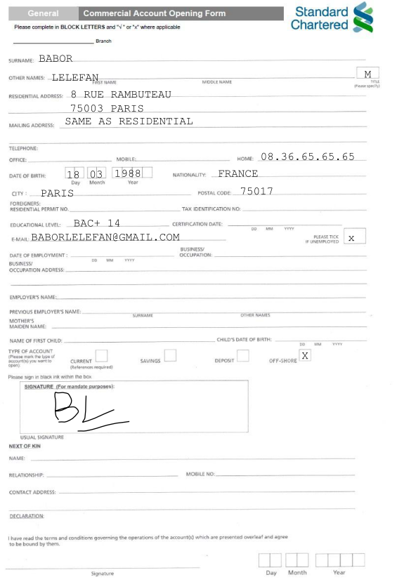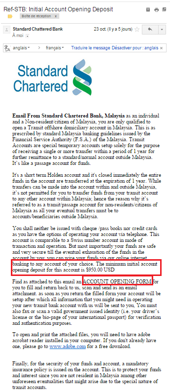 Comme il ne peut pas s’en empêcher, il m’envoie un mail à rallonge complètement inintéressant qui essaie de rendre l’opération crédible. Et pour la première fois, il est question que je donne de l’argent sous couvert d’un montant minimum à l’ouverture du compte. Il me joint également un formulaire pour ouvrir le compte. Je le remplis avec plaisir.