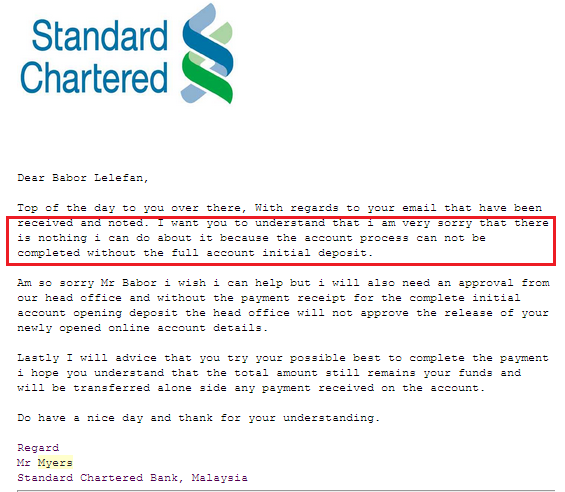Me voilà donc l’heureux propriétaire d’un compte à la prestigieuse Standard Chartered Bank. Maintenant, ce brave Song Chen compte bien récupérer son argent. Je veux veux bien donner de l’argent moi, mais comme je veux pas me faire avoir sans contrepartie, je décide de négocier un peu. 950$, ça reste reuch pour une ouverture de compte. Je tente donc de négocier avec « Mister Myers » dans un premier temps.
