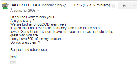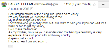 Evidemment je me prends un vent, on ne négocie pas avec un banquier aussi aguerri que Mister Myers, du coup je parle de mes problèmes d’argent à mon ami Song Chen, qui lui, saura sans doute être plus compréhensif. (je vous ai pas mis tous les mails, mais entre temps il arrêtait pas de m’oppresser pour accélérer le processus, ce vieux casse-couille).