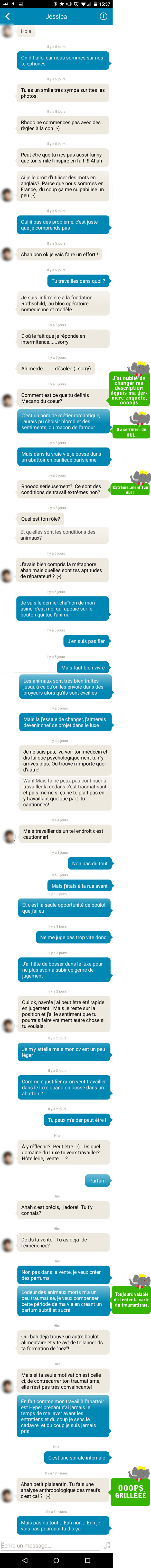 Comme je refuse que les filles avec qui je matche ne s’intéressent qu’à mon physique, j’ai fait croire à Jessica que je travaillais dans un abattoir, pour voir son degré de tolérance.