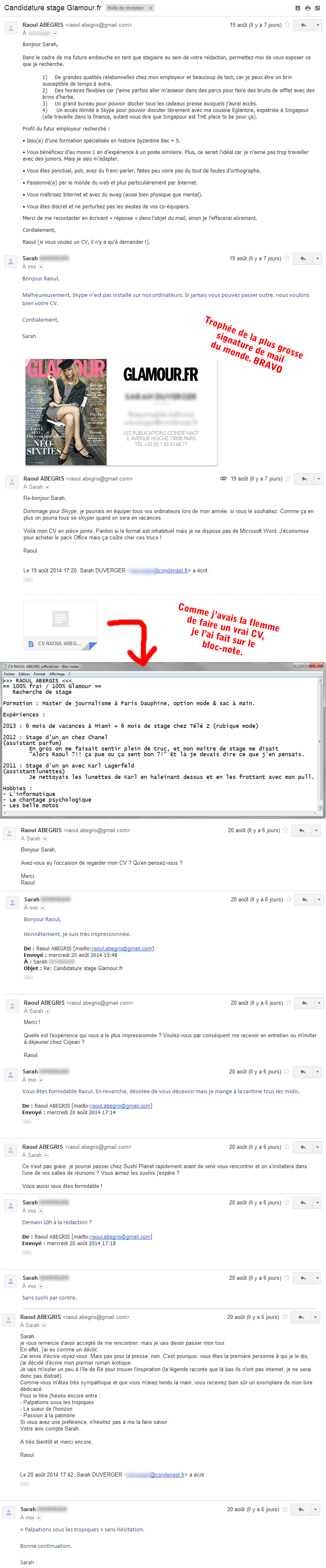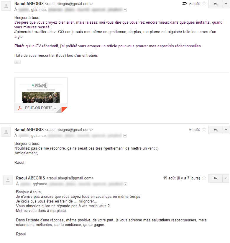 Si j’en crois mon expérience de l’année dernière quand j’avais postulé chez Grazia, j’ai envie de répondre oui. J’avais d’ailleurs tenté de reprendre contact avec la jeune fille en questions quelques mois plus tard pour aider un jeune homme dans le besoin à trouver un stage (et essayer de la niquer, évidemment). Mais comme deux vérifications valent mieux qu’une, j’ai tenté ma chance dans deux autres magazines : GQ, et Glamour.