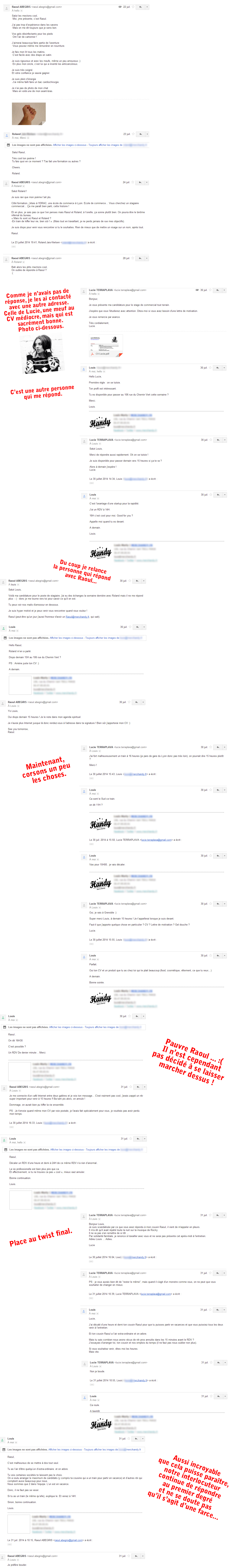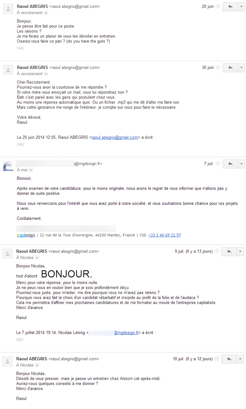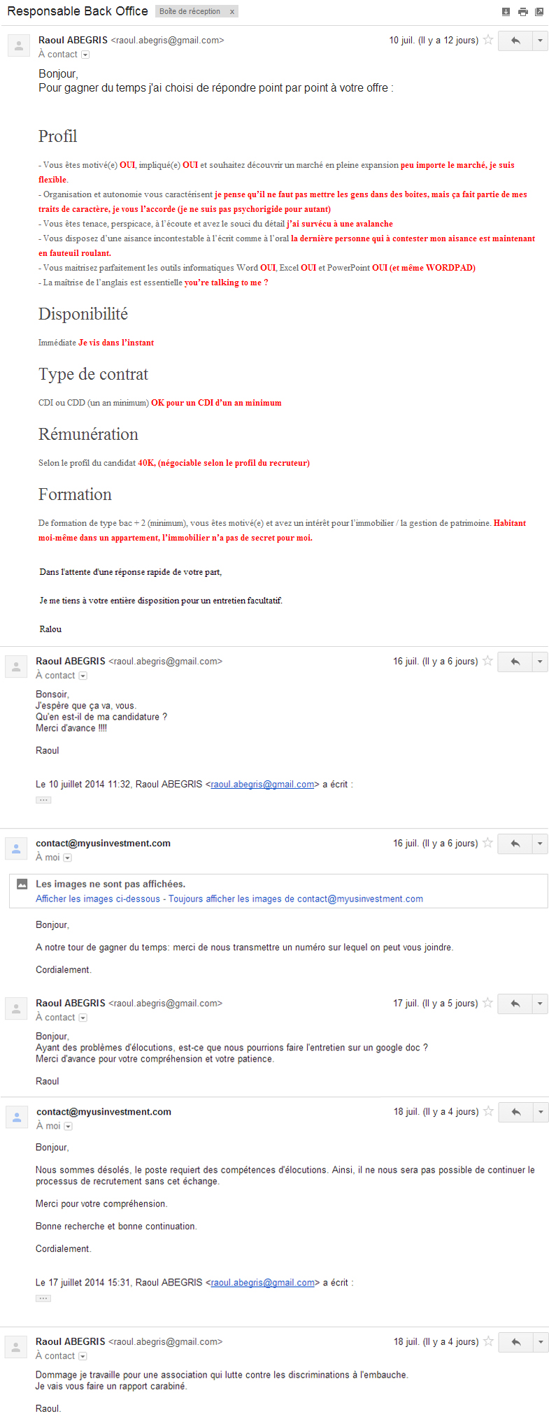 Le concept est simple, j’ai copié collé l’annonce et j’ai complété directement dessus, ça gagne un temps fou. J’ai même failli avoir un entretien téléphonique, mais j’ai préféré me dégonfler, comme une grosse lavette que suis. Toute façon, un job de perdu, dix de retrouvés, pas vrai les chômeurs ?!