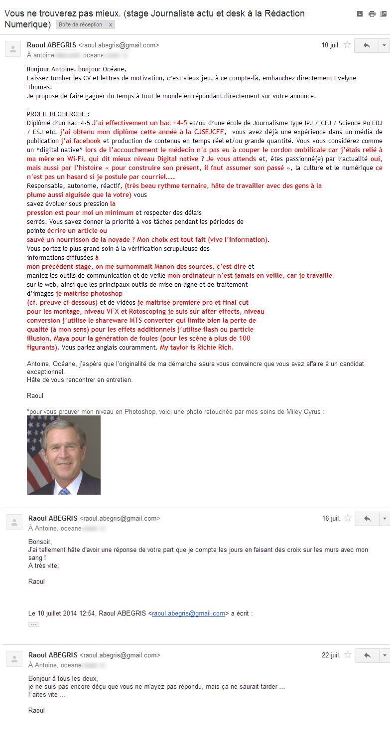 Cette méthode m’aura également valu un gros vent chez RTL, mais comme je me suis trouvé très drôle je vous mets quand même mon mail, à titre d’exemple.
